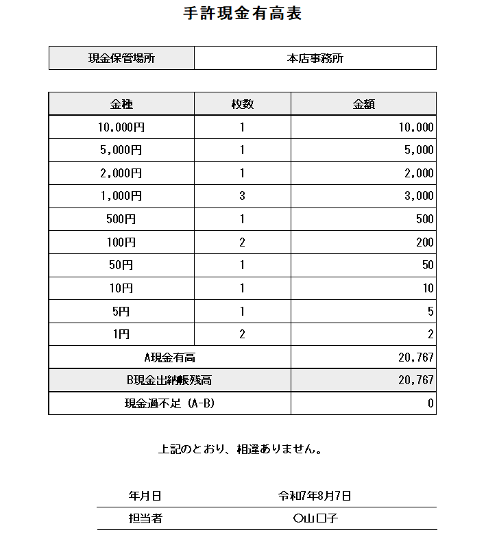 「手許現金有高表」は、「手元に存在している現金の内訳や金種ごとの金額」を明示したものであり、現金の過不足を見える化するための重要な資料です。